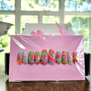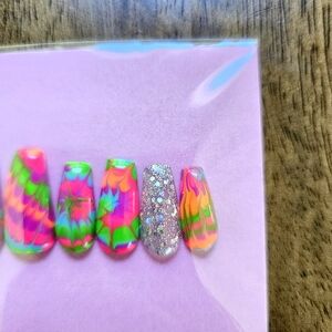 Check out this glamourous and funky set of tie dye custom press on nails from an Etsy seller! Perfect for any party occasion, music festival, or concert!