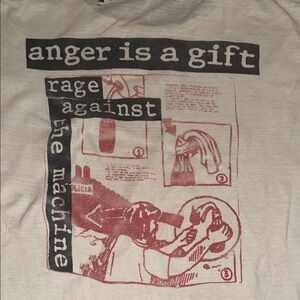 White t-shirt featuring a Rage Against the Machine graphic. Perfect for music fans.