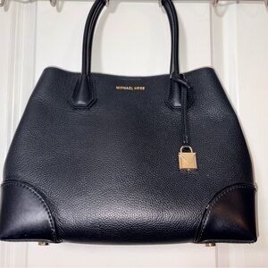 lassic Michael Kors Mercer Gallery medium satchel crafted in black pebbled leather with smooth leather corner panels and gold-tone hardware. Features structured silhouette, dual top handles, center zip compartment, and signature MK logo lining. Finished with removable lock charm hangtag. Satchel tote.