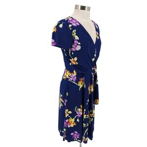 LRL Ralph Lauren Faux Wrap Fit Flare Dress Blue Floral Short Sleeve V Neck Zip 6