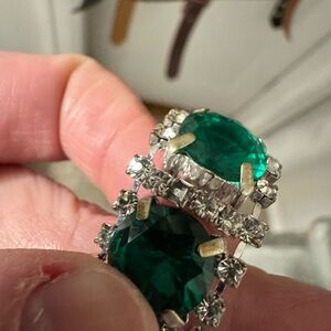 This stunning vintage costume jewelry bracelet features vibrant green stones (likely glass) set in a sleek silver tone setting, offset by clear rhinestones. Good vintage condition - missing one clear rhinestone (see last photo). Beyond that all prongs are tight. Some wearing of the plating (or maybe it’s tarnishing? I don’t know) on the backside of the bracelet. Approximately 7 inches long, with clasp. Brand unknown.