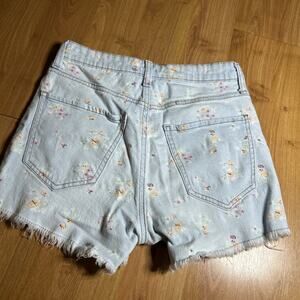 Celebrity Pink Doll floral printed denim jean shorts with a frayed hem