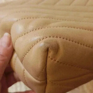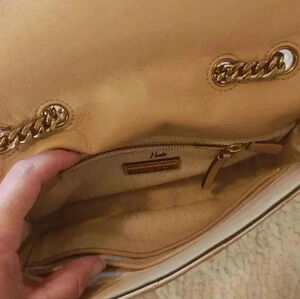 This elegant beige quilted bag features a gold chain strap and the iconic Tory Burch logo. Perfect for hands-free convenience and adding a touch of luxury to any outfit. This bag is in good pre-owned condition. please zoom in to examine signs of wear before purchasing.