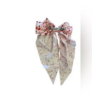 Add a touch of romance to your outfit with this elegant pink and red heart patterned bow. Perfect for any occasion.