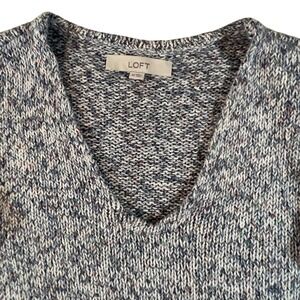 LOFT marled/speckled blue/white/pink women's XS long sleeve pullover v-neck sweater. Relaxed fit in a tunic length. Soft, slouchy, ribbed cuffs and hem, retro vibe, cozy, warm.