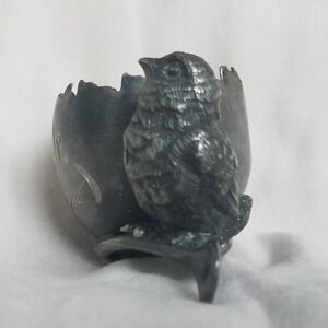 A charming vintage egg cup holder featuring a detailed bird perched on a spoon, alongside a cracked eggshell-shaped cup. This unique piece adds a whimsical touch to any breakfast table or collection display. It is perfect for serving soft-boiled eggs or as a decorative accent for a collector of ornithology or vintage tableware.