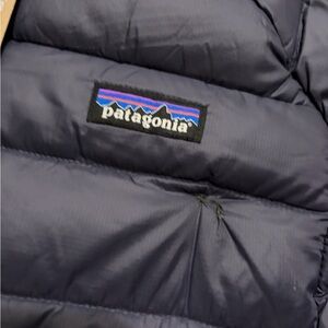 Patagonia Women's Down Sweater jacket in a navy blue color XL New with tags but there is a small hole that has been sewn by the outer label the jacket comes with the matching patch kit to cover it never been used
