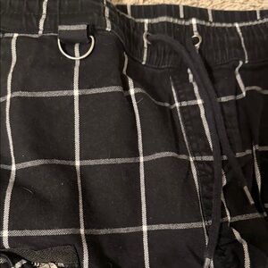 Trendy cargo pants with a grid pattern. Features zippered pockets for style and utility.