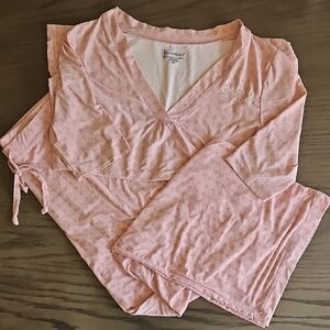 Pink V-neck top with subtle pattern and matching drawstring pants.