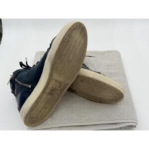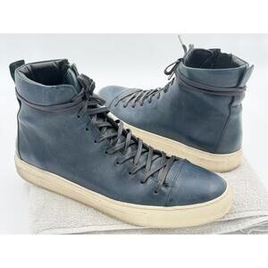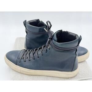 These are a beautiful pair of John Varvatos Blue High Top Sneakers in size 12. They have seen some light wear, but the leather is in great condition. These are hard to find, particularly in larger sizes. You will not be disappointed!