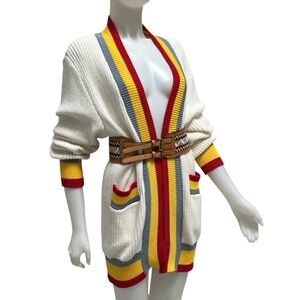 This stylish Sandy Lane white open cardigan from CENTRAL PARK WEST New York features bold red and yellow stripes, a v-neck design, and a comfortable, relaxed fit. Its substantial soft ribbed knit offers warmth and coziness, perfect for casual occasions.