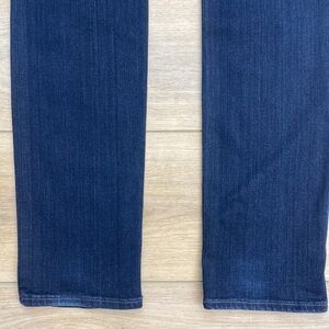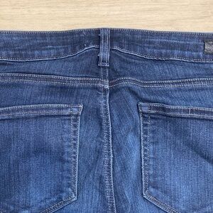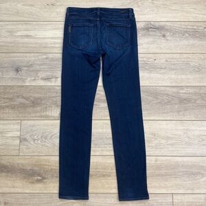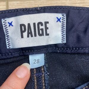 Dark blue classic mid rise Skyline Skinny Jeans by Paige denim. The soft and stretchy brushed denim is super comfortable and is a perfect casual foundation for any outfit. Some minor puckering around the inseam that is not visible when wearing, otherwise no flaws and gently used overall. Size 28