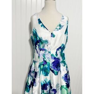 Dress Barn Floral Satin Sleeveless V- Neck Fit & Flare Mini Dress White Blue 12