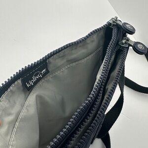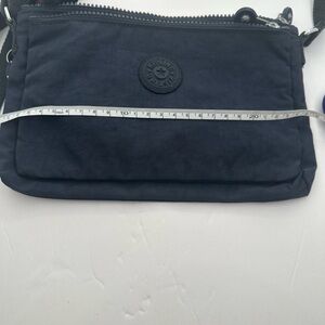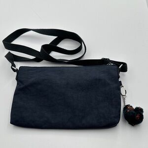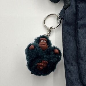 Stylish navy crossbody bag with adjustable strap. Features a playful keychain accessory.