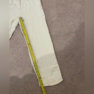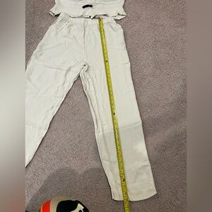 Bottom- garterized waistline, straight leg, no pockets