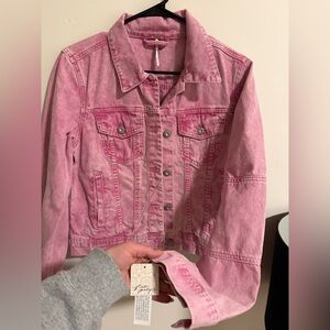 Chic pink jean jacket with button-up front.