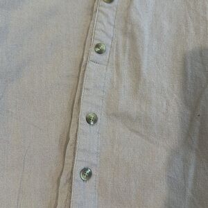 Effortlessly chic and perfect for warm weather, this linen midi dress features a flattering side button detail that adds a touch of vintage-inspired charm. Made from breathable, lightweight fabric, it’s ideal for summer days, casual outings, or vacation wear. Its minimalist silhouette makes it easy to dress up or down — pair with sandals for a relaxed look or elevate it with a belt and heels. 70% Rayon, 30% Linen. Size medium.