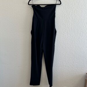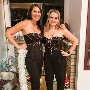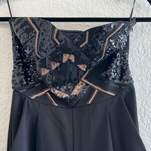 This elegant black jumpsuit features stunning sequin detailing, perfect for a night out. The sleek design offers a flattering fit, making it a must-have addition to your wardrobe. Zipper closure on side. Pockets on both sides. Worn one time.