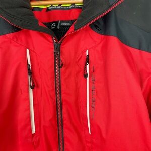 Vibrant red with black accents. Perfect for winter sports. Durable and stylish design. Worn once . Size XL