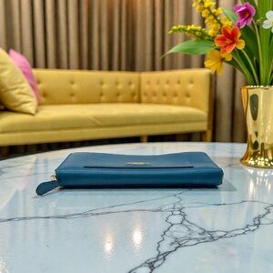 Classic Coach style with elevated functionality. This sleek accordion zip long wallet is crafted from rich teal leather and features a convenient front slip pocket with the Coach logo. Spacious, organized, and timeless…perfect for everyday use or travel.