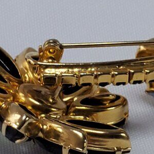 This intricately designed vintage brooch captures the elegance of a flower, with black crystals set in a gold-tone finish. The rhinestone accents add a touch of sparkle, making it an exquisite accessory for both formal and casual occasions. Crafted with precision, this brooch is a timeless piece that enhances any outfit.
