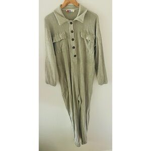 Size small from Free People’s Beach Line - sage light green gauzy jumpsuit. Button up with a collar. Comfy & cozy. The calico one piece utility jumpsuit. EUC