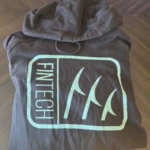 This is a comfortable, soft black (Anthracite) hoodie featuring the unique Fintech logo graphic in a light teal/aqua color on the chest and a smaller version on the back under hood. It's a great casual piece with performance features! Outdoors, Fishing, Boating, Hiking