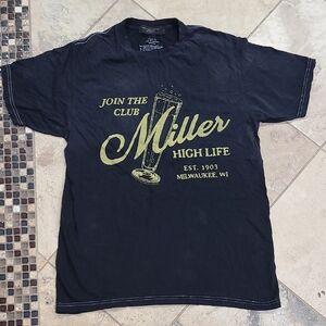 Bold black tee with yellow graphic. Features 'Join the Club' and 'Miller High Life' text. Casual and stylish.