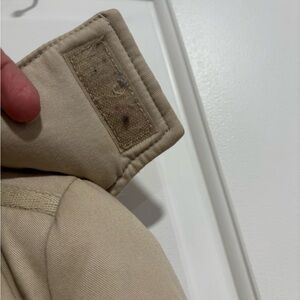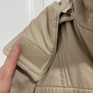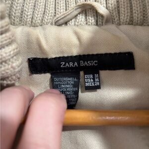 Stylish ZARA Basic padded utility jacket in a classic beige/tan color. Features a cozy ribbed knit collar, button and zip front closure, multiple front pockets, and adjustable details for warmth and comfort. Perfect for fall and winter layering with casual or everyday outfits.