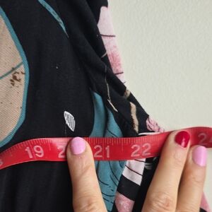 Elegant black dress with a vibrant floral pattern, perfect for any occasion. Small holes in dress. see video.