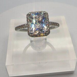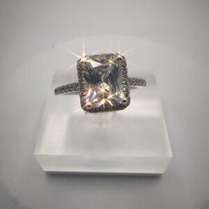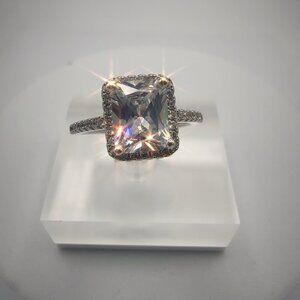 This stunning ring features a radiant cut cubic zirconia stone that captures light beautifully, creating a captivating sparkle. Surrounded by a halo of smaller stones, the ring offers elegance and sophistication. Perfectly crafted for those who desire luxury without the high price of diamonds, making it an exceptional choice.