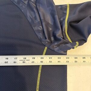 Color: Navy blue with tonal camo panels at shoulders/sleeves and neon yellow contrast zipper and stitching.