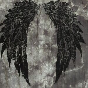 Eighty Eight button down shirt in size large featuring a unique tie-dye effect with bold graphic prints. The front showcases a stylish fleur-de-lis emblem on the chest, while the back boasts striking black angel wings. Crafted from 100% cotton, this long-sleeved shirt offers comfort and distinctive style perfect for casual outings, concerts, or motorcycle rallies.