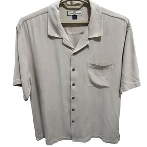 Keywords: Tommy Bahama, silk shirt, button down shirt, camp collar shirt, mens shirt, short sleeve shirt, beige shirt, XL shirt, casual shirt, luxury shirt, beach shirt, resort wear, collared shirt, silk top