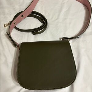Beautiful Ampere Creations crossbody bag in olive green vegan leather with a blush pink interchangeable strap. Includes both the wide statement strap and a slim matching crossbody strap so you can switch up your look.