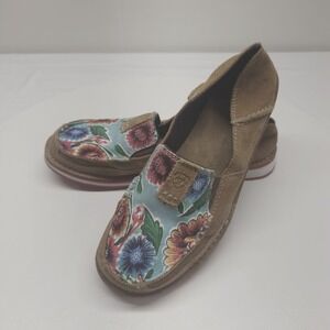 Keywords: Ariat shoes, womens loafers, suede shoes, floral print, slip on, casual shoes, comfortable footwear, bohemian style, ranch wear, everyday shoes, weekend style