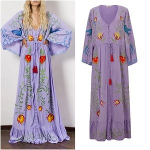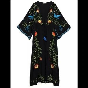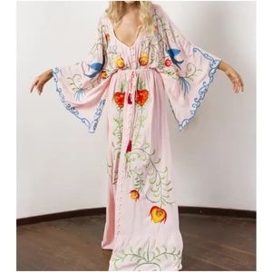 Boho Embroidered Hearts magic Floral Birds Long Maxi Kimono Dress