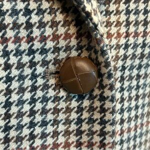 Excellent condition. Like new condition. No signs of wear. Two extra buttons on the inside tags attached. Single breasted. Full leather fabric covered buttons. A little bit of a red shade throughout the Browns.