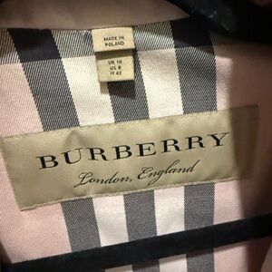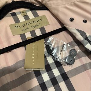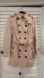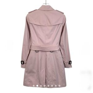 Chic light pink trench coat with double-breasted front. Features a belted waist and classic design.