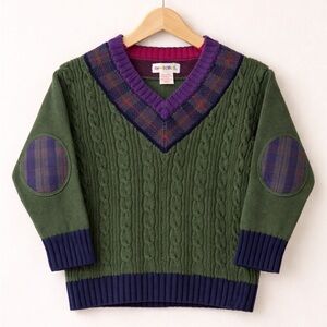 Chic V-neck sweater with cable knit design. Features green body with purple and navy accents. Stylish elbow patches add flair.