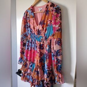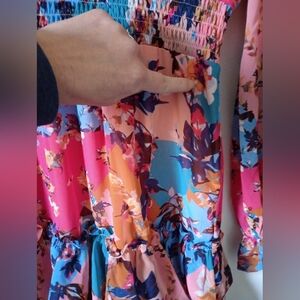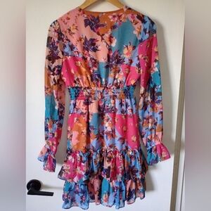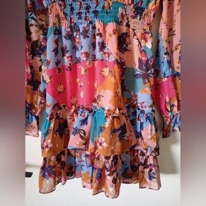 This vibrant floral dress features a stunning mix of pink, blue, and orange hues in a patchwork pattern. Perfect for any occasion, it offers a flattering fit and tiered ruffles on the bottom, a v-neck, elastic at the waist, and ruffles at the ends of the sleeves. Sleeves are sheer, bodice and skirt are lined. Small run on the front near the side, but thanks to the busy pattern on the dress it's not really visible unless you're specifically looking for it. See the last two pictures to see it. Other than that small flaw, it's in very good gently used condition from a non-smoking home. A super cute dress!