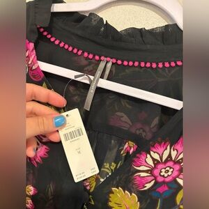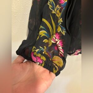 Chic black blouse featuring vibrant pink floral patterns. Lightweight and stylish.