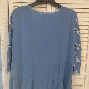 Elegant blue blouse with intricate white floral embroidery. Features a V-neck and flared sleeves. Measures 21 inches pit to pit and 25 inches long