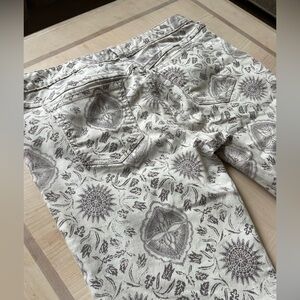 Chic ankle jeans with a unique geometric pattern. Perfect for a trendy look. Beige and a dark brown/purplish print. Size 29. In great used condition! No stains or tears. Perfect wardrobe piece!