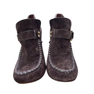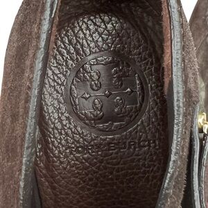 TORY BURCH Belen Suede Ankle Stiletto Moccasin Booties. Brown with Gold Buckle. Women’s Size 10.5.