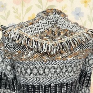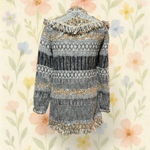 Lucky Brand Fringe Knit Cardigan Sweater Medium Boho Tribal Open Front Aztec