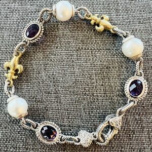 Beautifully crafted Judith Ripka sterling silver bracelet featuring her signature fleur-de-lis link design, accented with rich purple amethyst stations, sparkling cubic zirconia, and genuine pearls. A timeless piece that blends elegance with classic Ripka detailing.