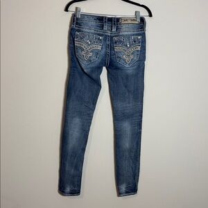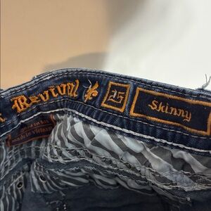 Rock Revival Laney skinny jeans. Good condition as shown. Missing the Rs on the back patch. Embellished bedazzled distressed design. Size 25, measures 27x30