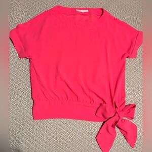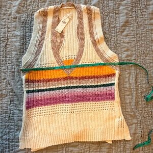 Black sweatshirt featuring pink and gold floral embroidery. I am petite, so sleeves were too long, but I loved the waist. Very flattering.
