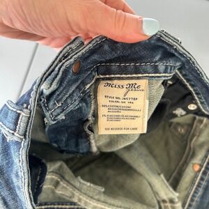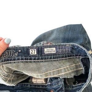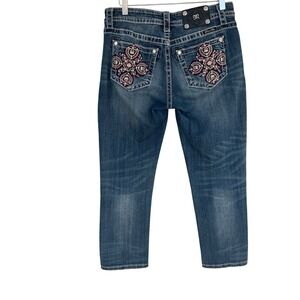 Miss Me Jeans womens size 27 boyfriend capri jeans. These jeans feature a dark wash denim with distressed detailing on the front and back. Intricate embellished designs adorn the back pockets, adding a touch of flair. Perfect for a casual day out or a music festival.